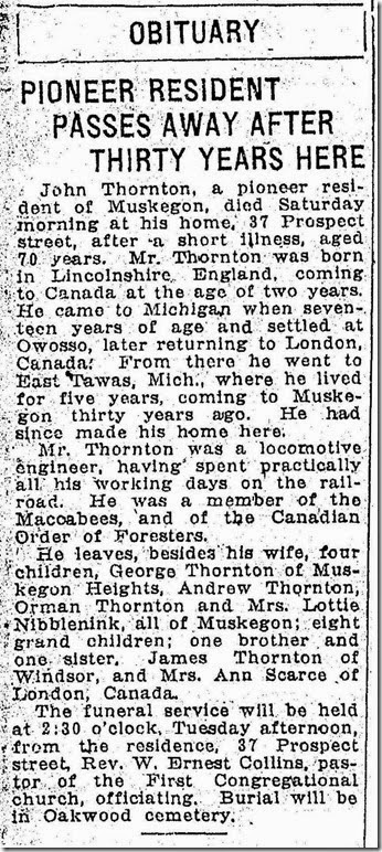John’s obituary4 gives quite a bit of information about his life. He came to Canada at the age of two and came to Michigan when he was 17 years of age, settling in Owosso. He later returned to London, Ontario, Canada and then to East Tawas, Michigan. From the obituary we learn that John was a pioneer resident of Muskegon, moving to the town in 1891.